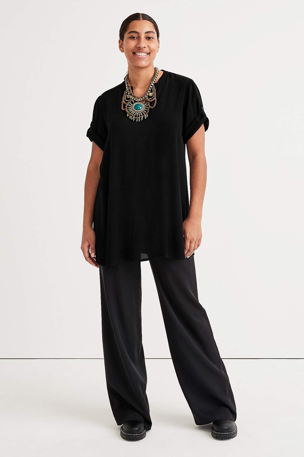 Crepe tunic top with v-neck and stand collar. Short sleeve with tamp and button. A-line design. The length varies with size: about 83-93 cm from the back shoulder.