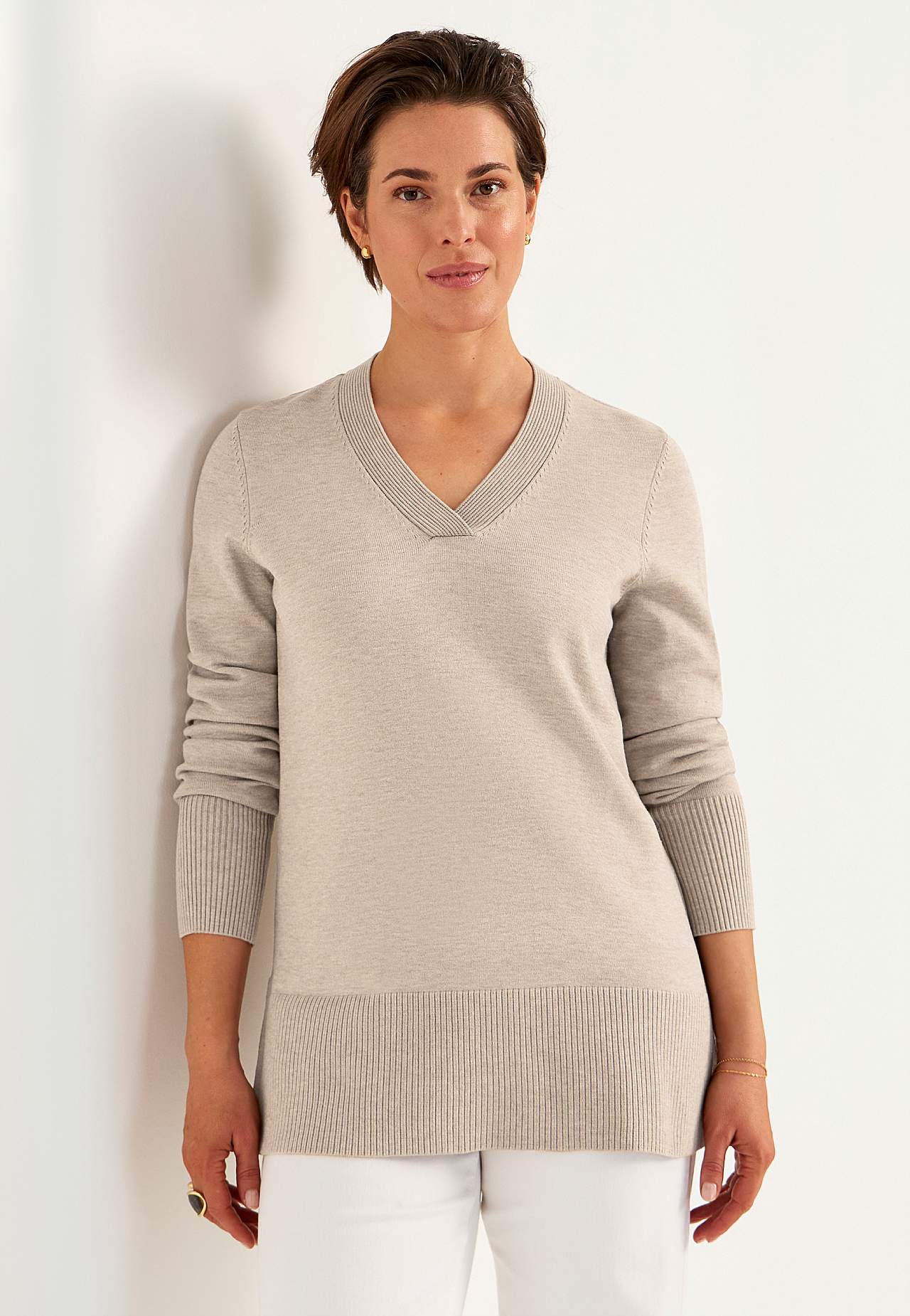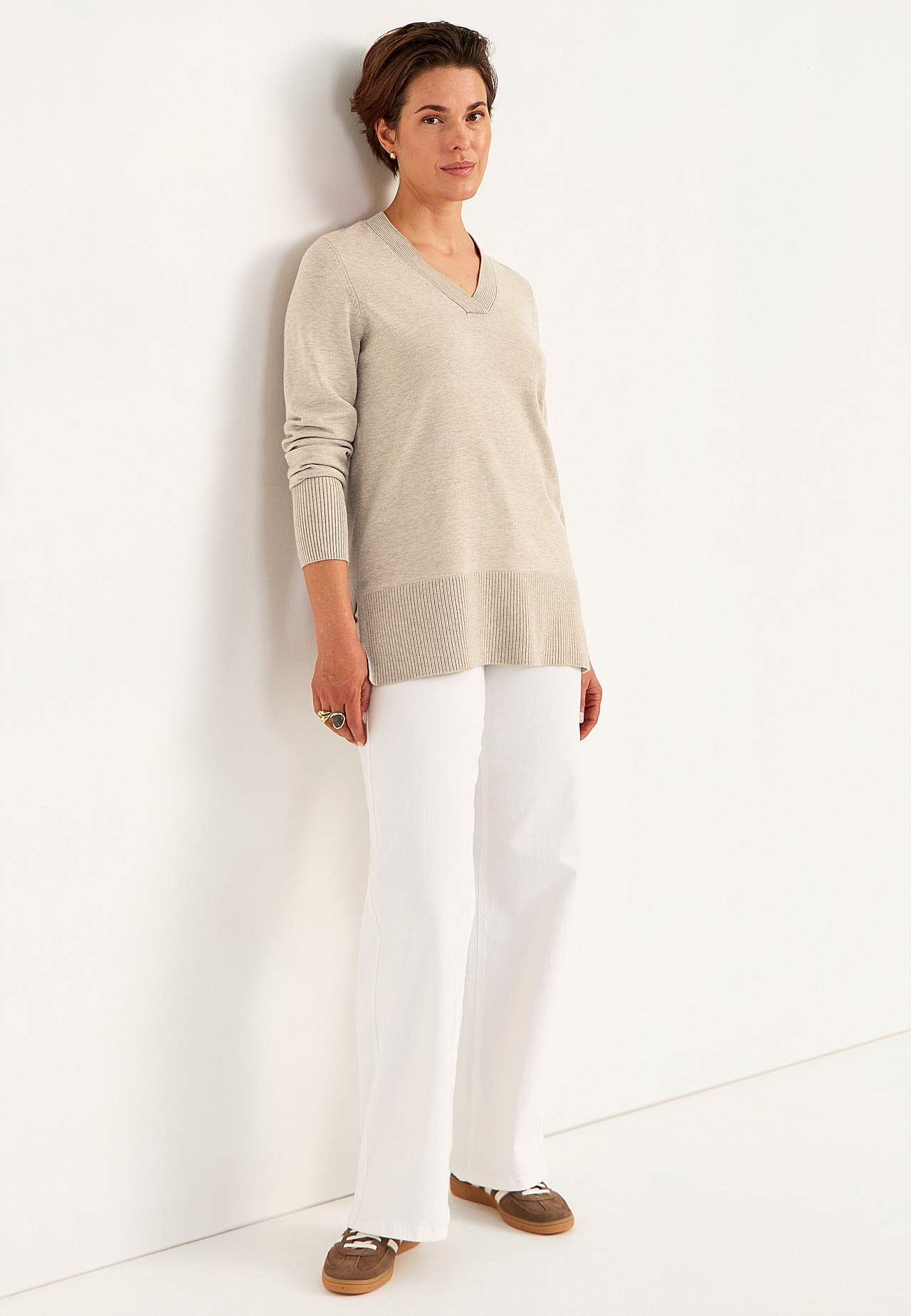 Soft, fine-knitted tunic top. Airy, nice quality. Regular fit. Deep v neckline. Long sleeves with wide ribbed cuff. Fully fashioned knitted armholes. Straight hem with high slits and wide ribbed cuff. The length varies with size: about 75-87 cm from the shoulder.