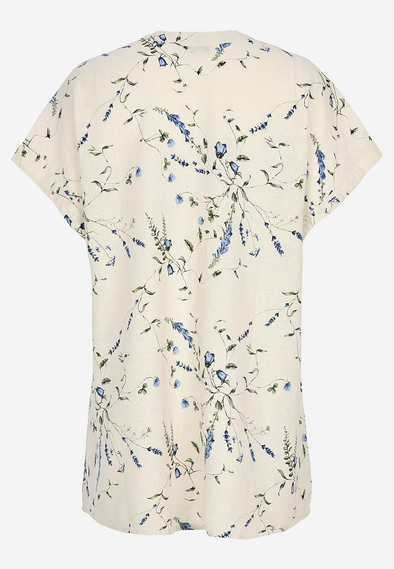 Lovely, cooling tunic with sheer floral pattern. Woven, airy material in soft viscose and linen blend with slight structure. Straight, casual fit. Rounded neck with small v-neck cut and button placket. Short cap sleeves. Rounded hem. The back length varies with size: approx. 77-84 cm.