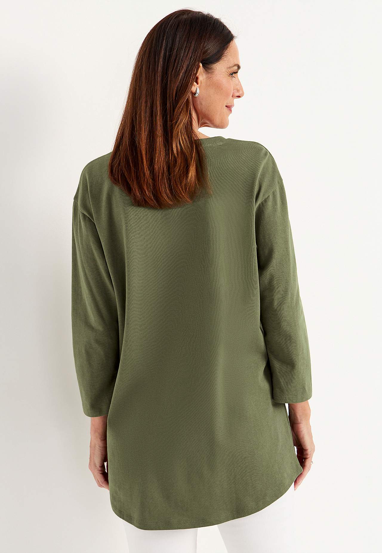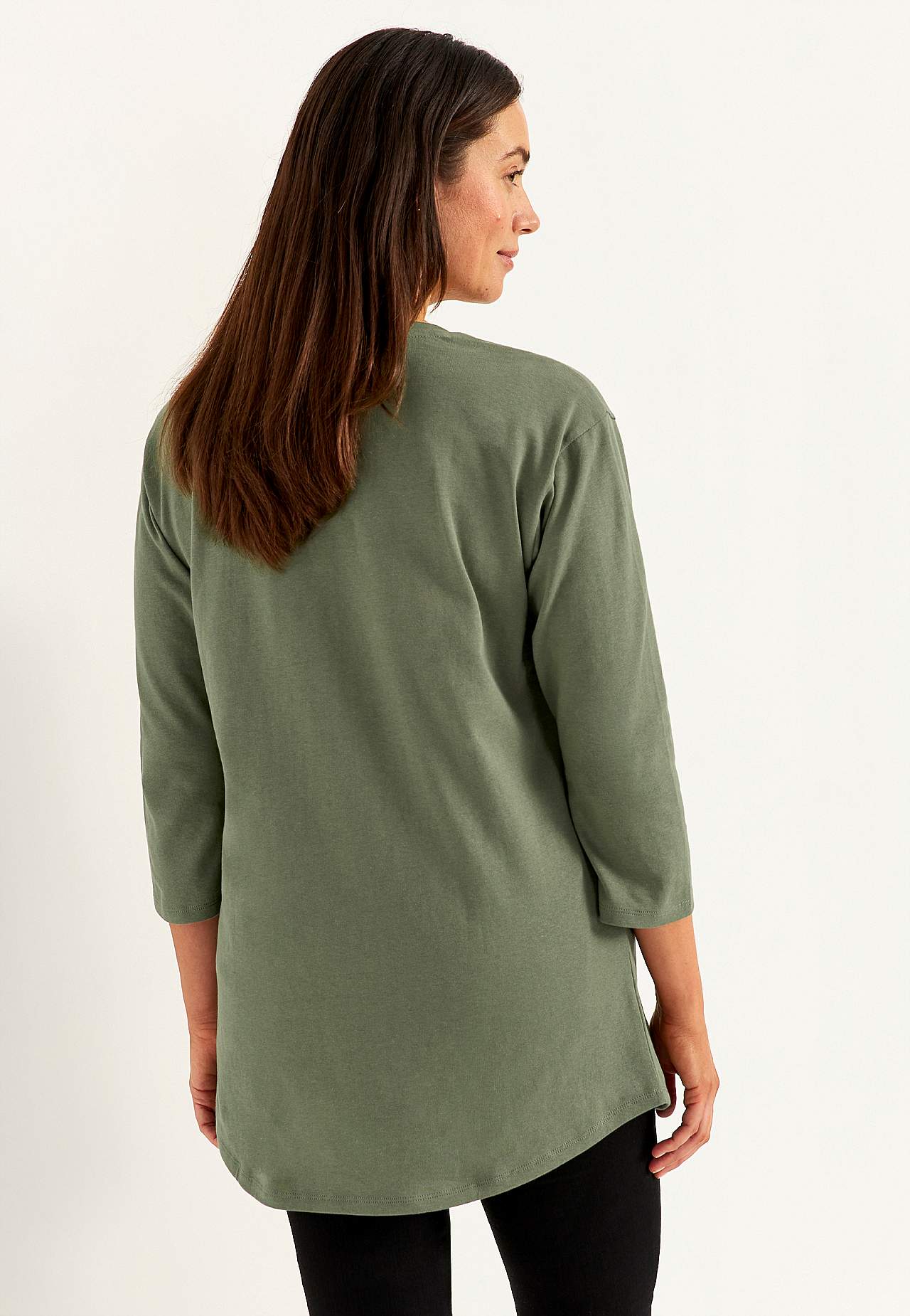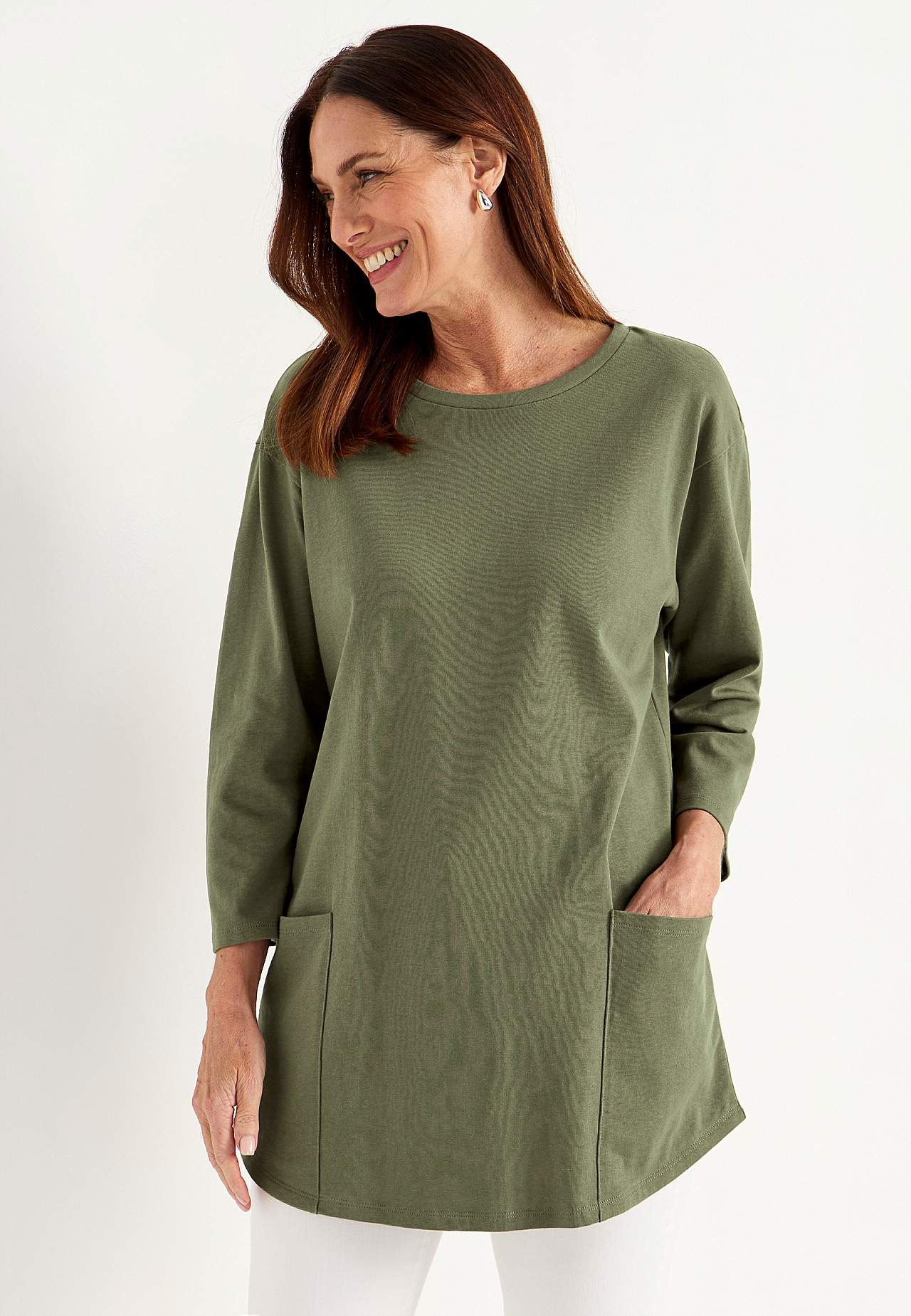 Tunic top with comfy, big pockets. Soft, firm, slightly heavier quality. Oversized fit. Round, ribbed neckline. Dropped shoulder. 3/4 length, slightly wider sleeves. Big patch front pockets. Rounded hem. The length varies with size: about 78-92 cm from the shoulder.