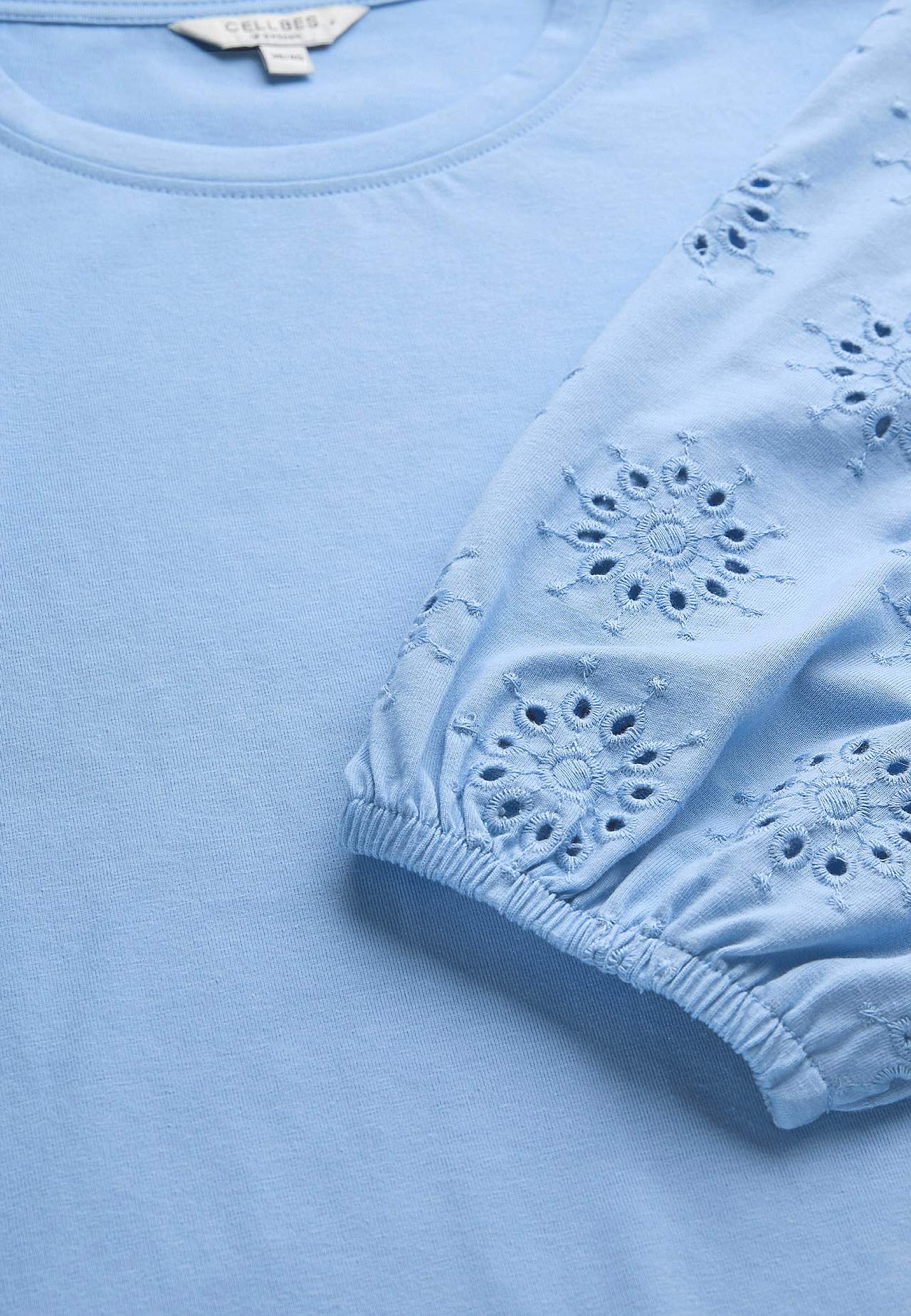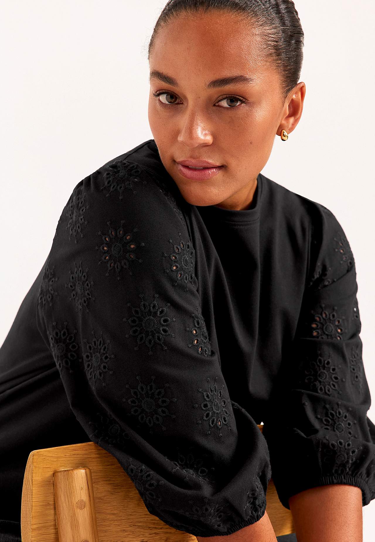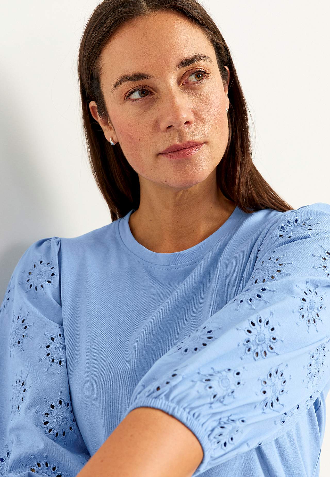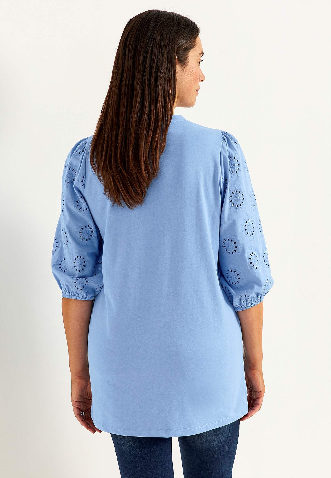 Tunic in slightly heavier, firm cotton mix. Regular fit. Striking gathering at the shoulders. Rounded neck. Wide, 3/4 length sleeves with openwork with broderie anglaise and elastic at the cuffs. Straight hem. The back length varies with size: approx. 78-86 cm.