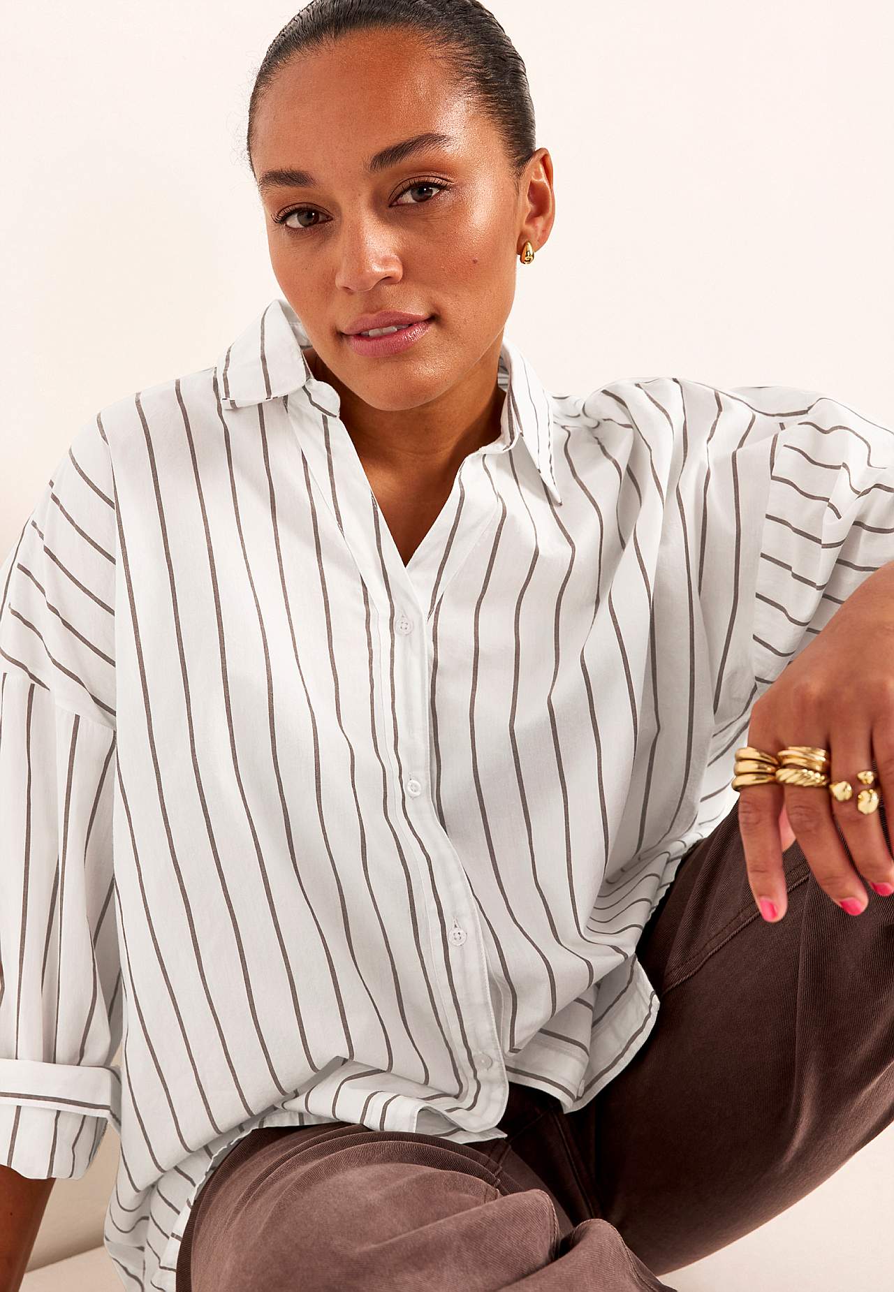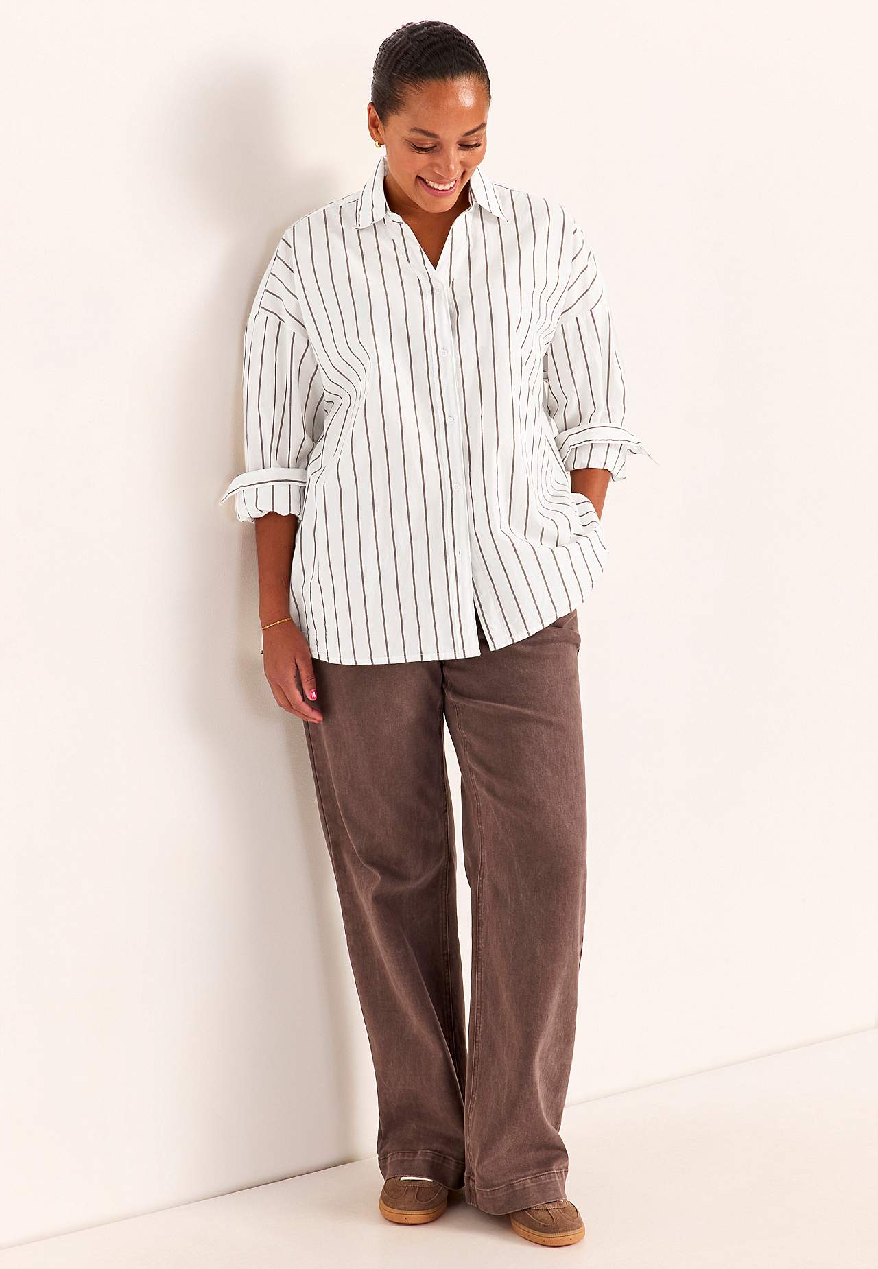 Longer shirt with classic collar and yarn-dyed, elegant stripe. Woven, soft material with crisp feel. Loose and casual fit. Classic collar and becoming v neckline. Dropped shoulder. Buttoned through model. Yoke on the back. Long sleeves with cuff and buttons. Rounded, slightly longer at the back hem. The length varies with... Read more