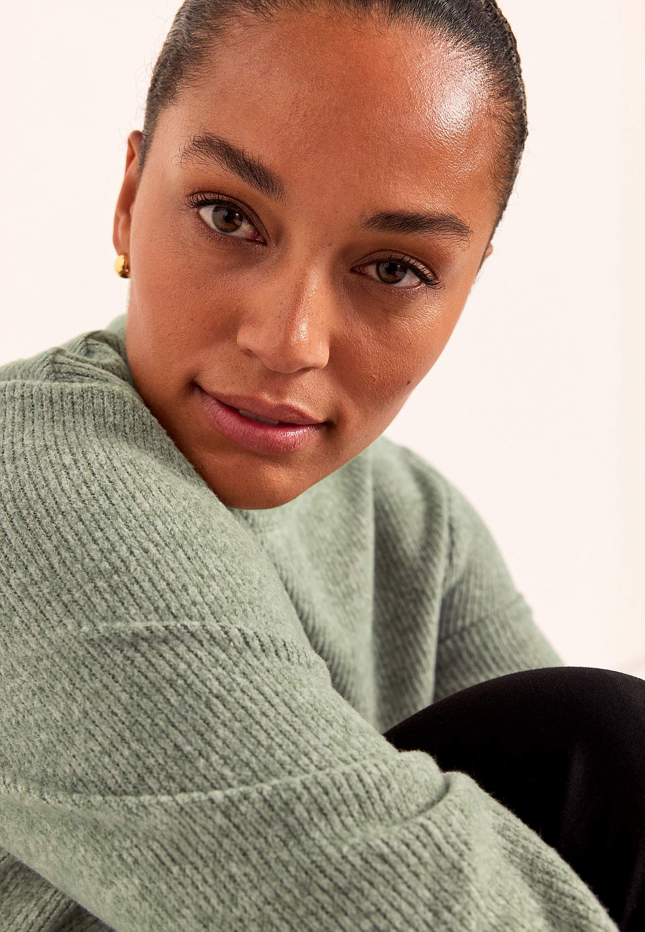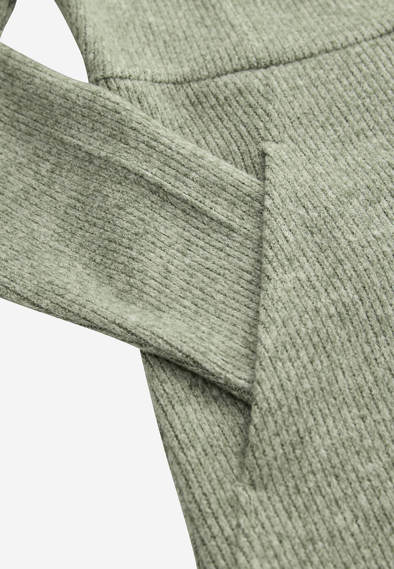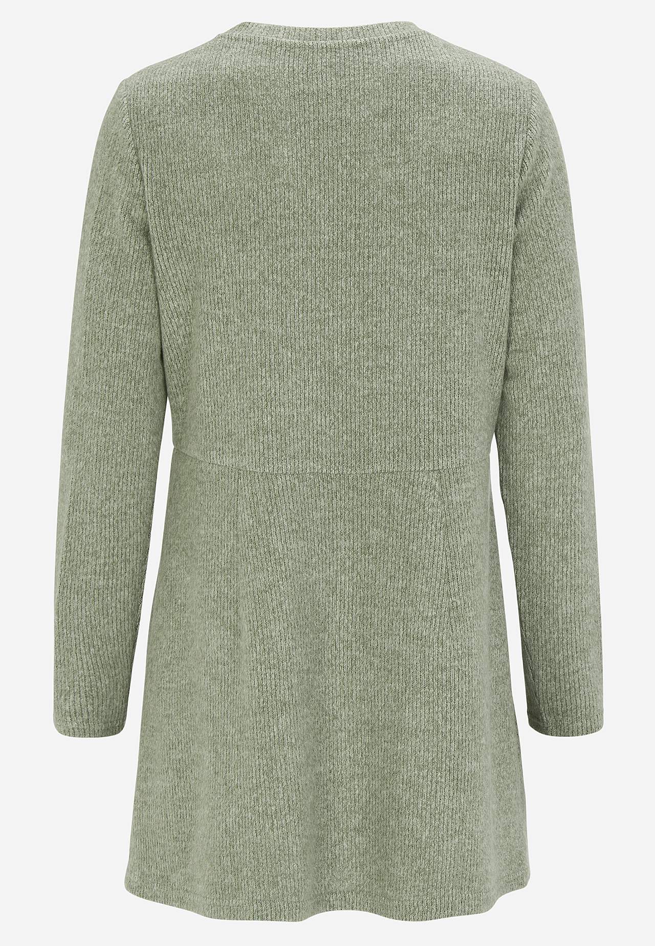 Soft, knitted tunic. Stretchy, ribbed material with brushed surface. Straight fit. Round neck. Fitted seams at front with sewn-in, hidden pockets. Decorative, horizontal center seam. Long, straight sleeves. Lightly rounded hem. The length varies with size: about 80-91 cm cm from the shoulder.