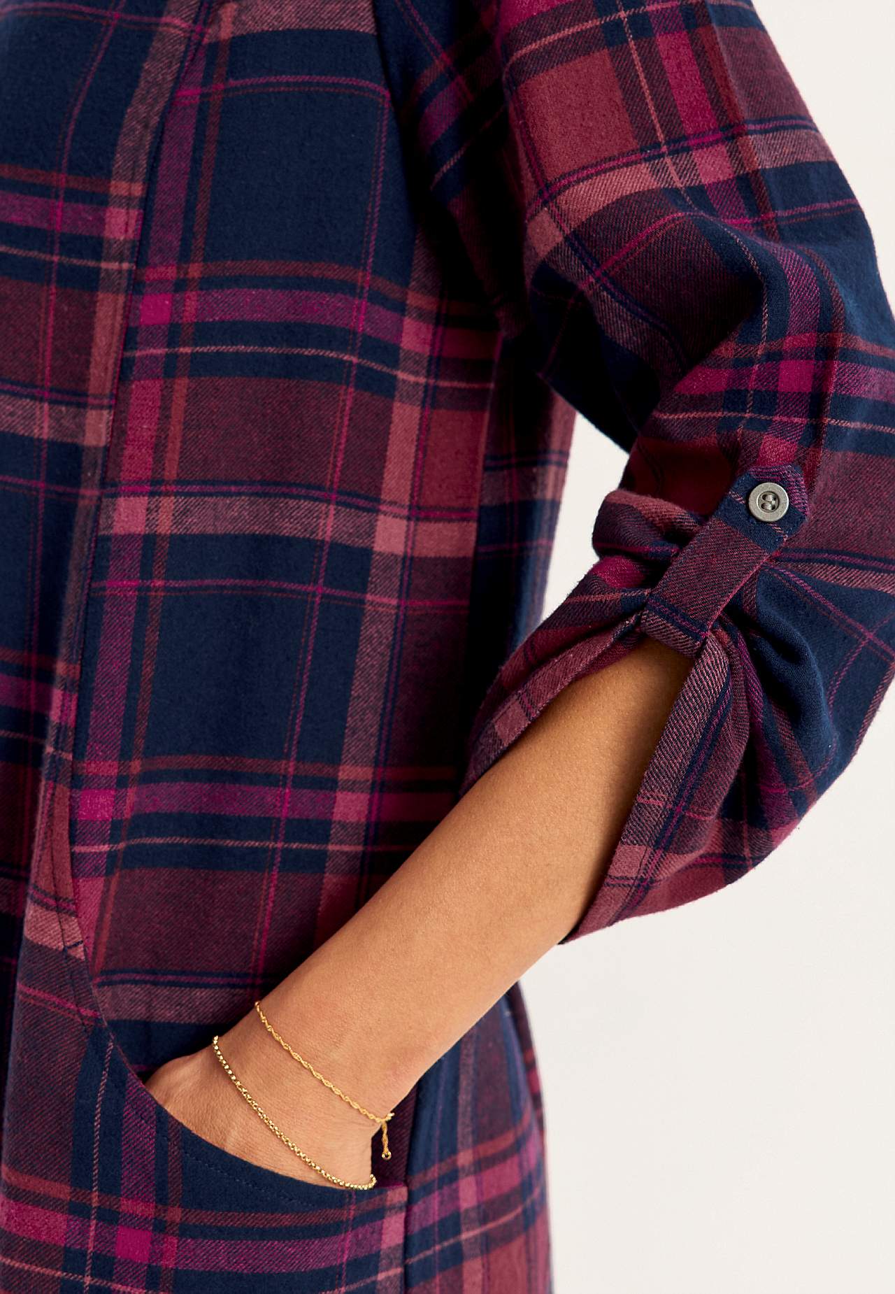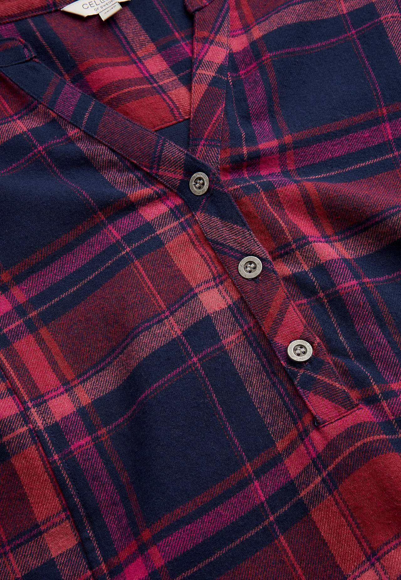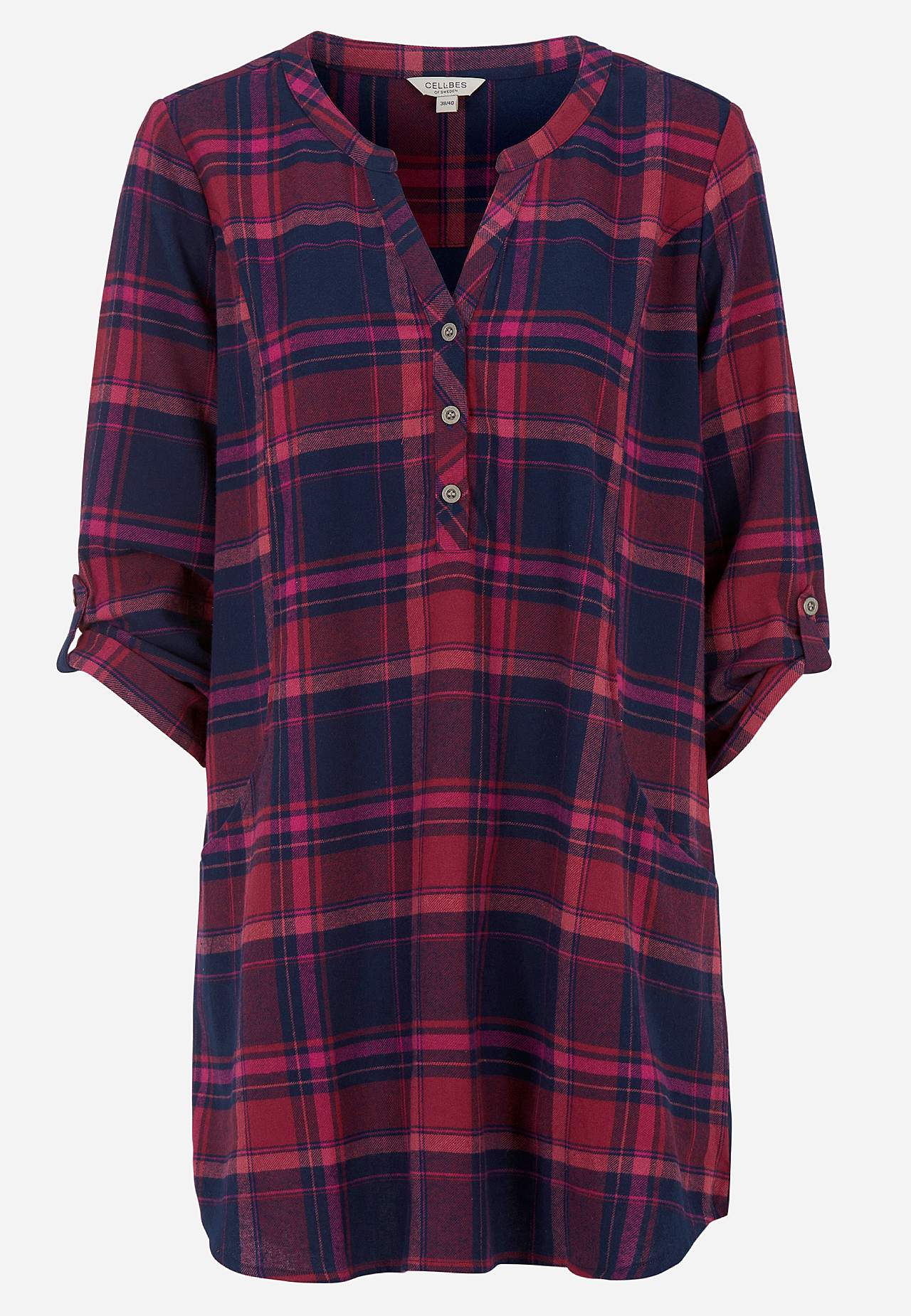 Slightly a-line-shaped tunic. Super soft cotton flannel. Rounded neckline with v cut and button placket. Yoke with nice pleat on the back. 3/4 length, foldable sleeves with tamp and button. Spacious pockets at the front. Rounded hem. The length varies with size: about 84-96 cm from the shoulder.