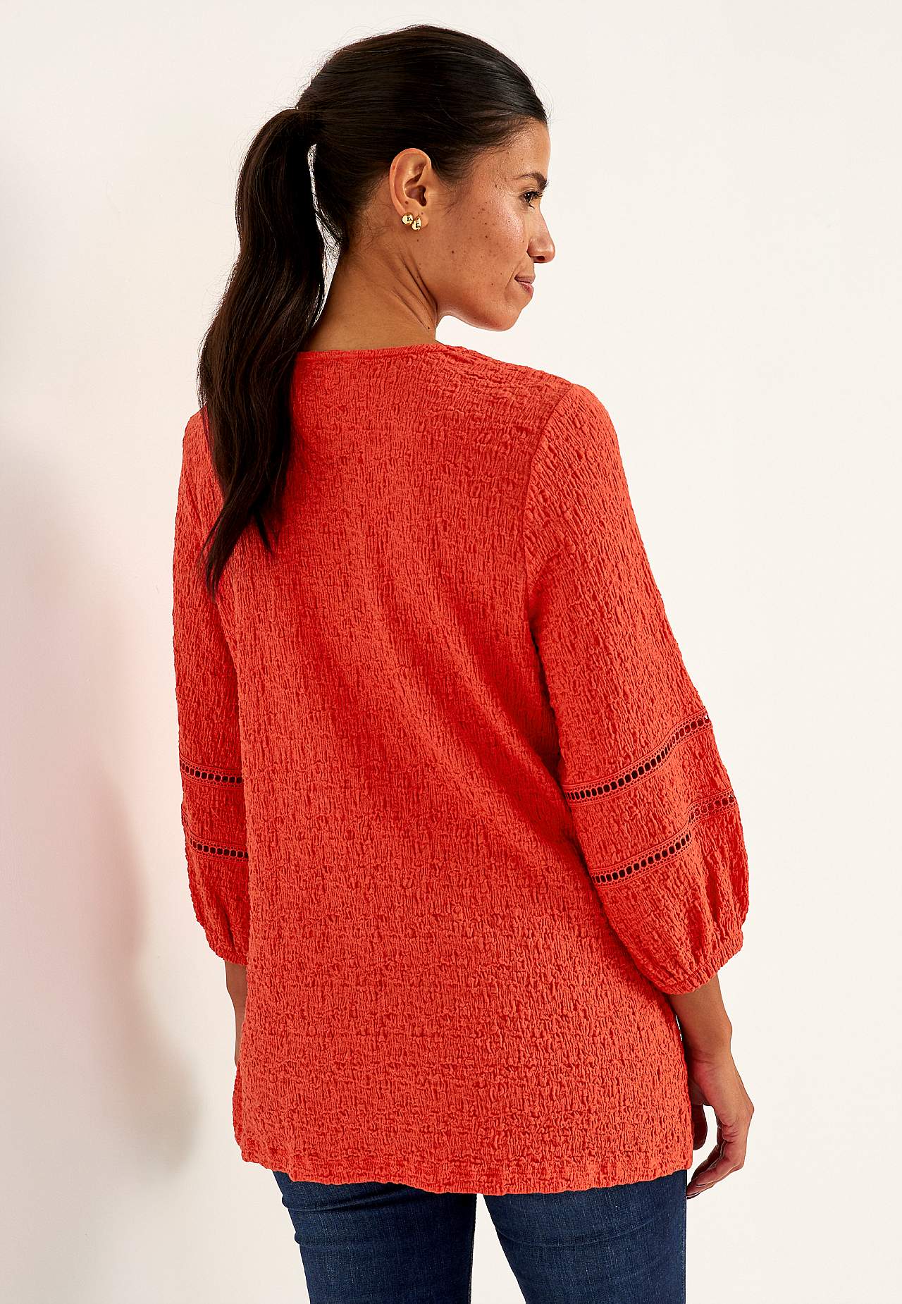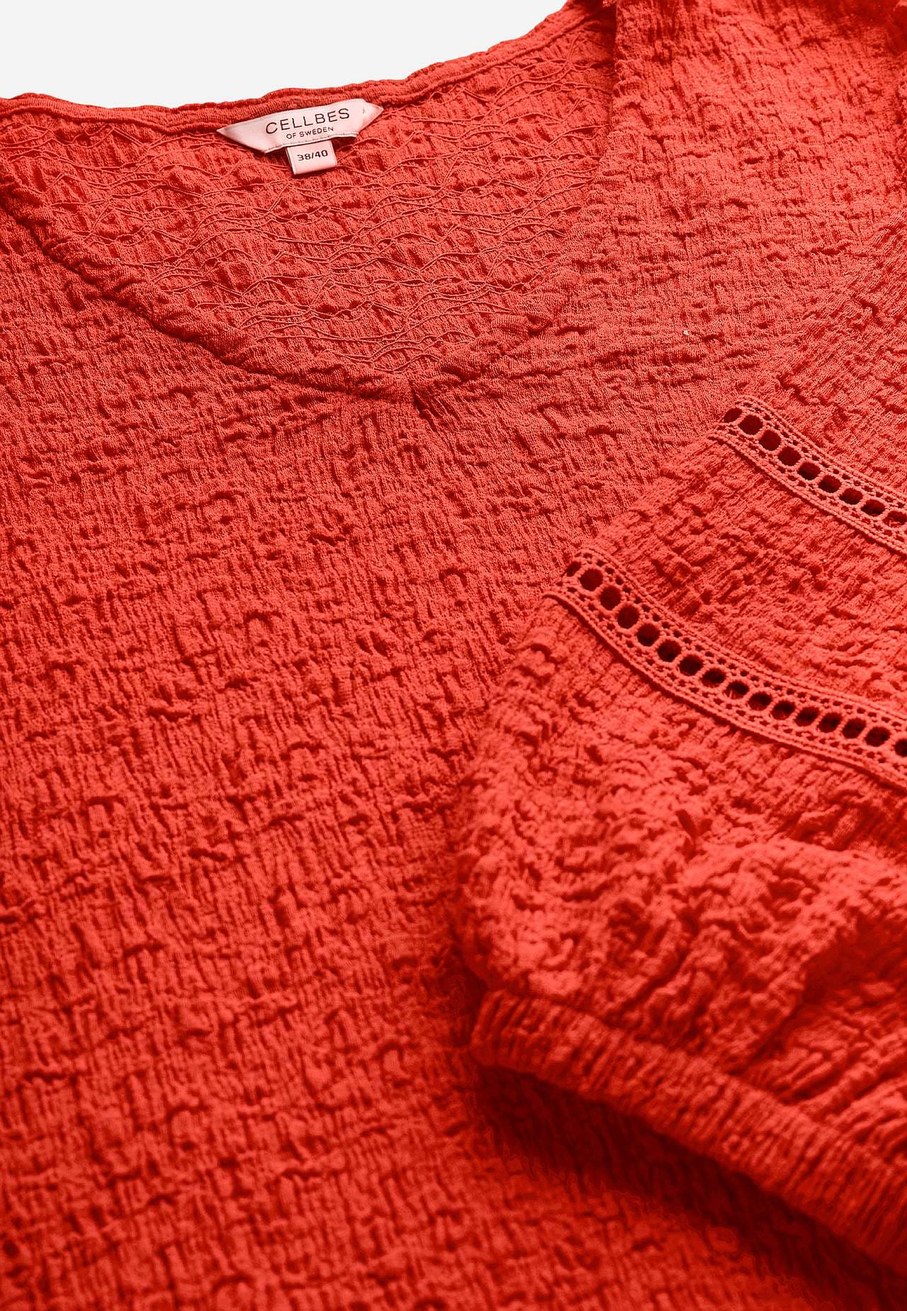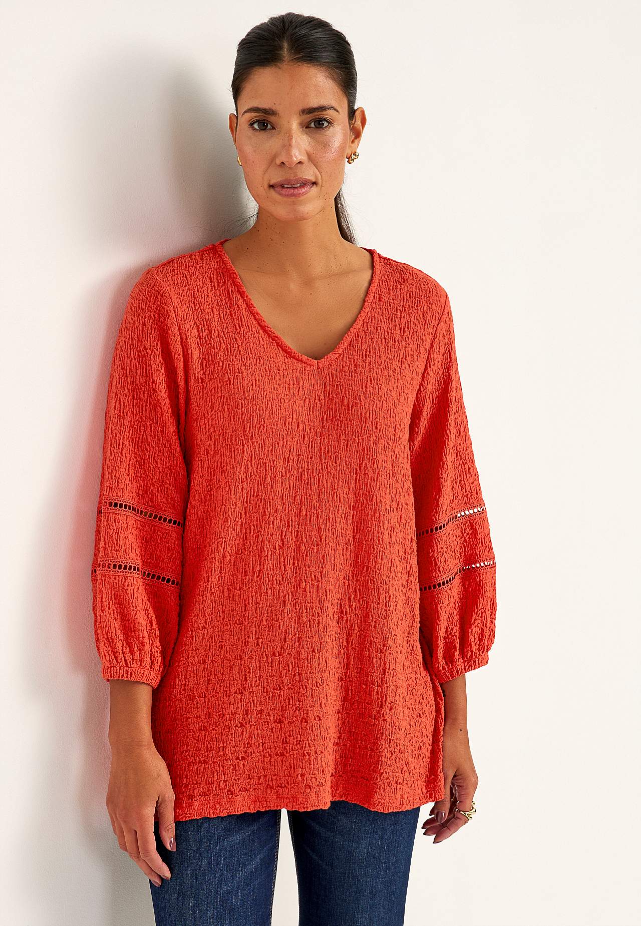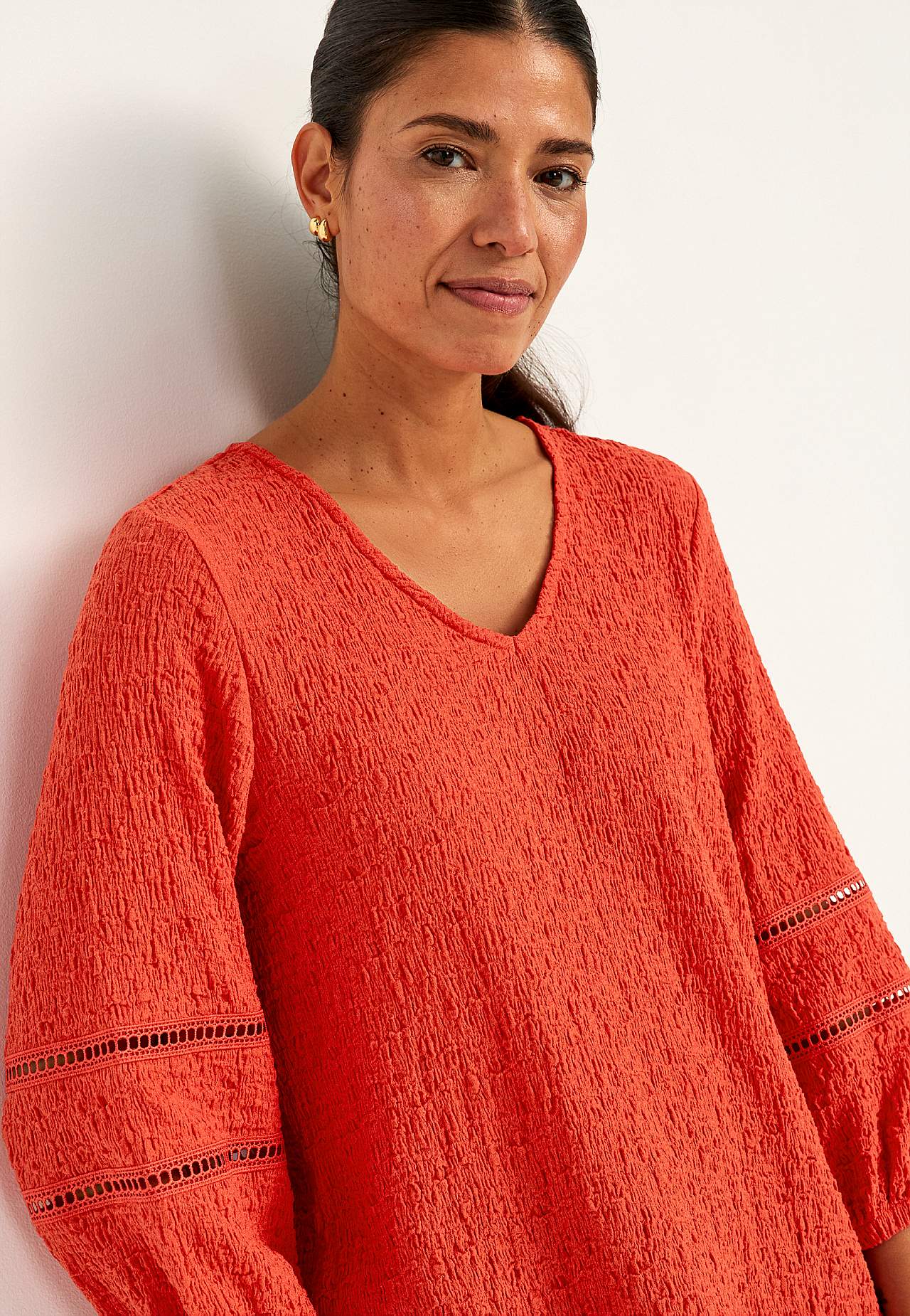 Tunic in comfortable, stretchy cotton-blend with structure. Nice details with openwork on the sleeves. Regular fit with gently flared bottom part. V-neck neck. 3/4 length, wide sleeves with elastic at the cuffs and decorative stitches with openwork. Straight hem. The back length varies with size: approx. 72-80 cm.