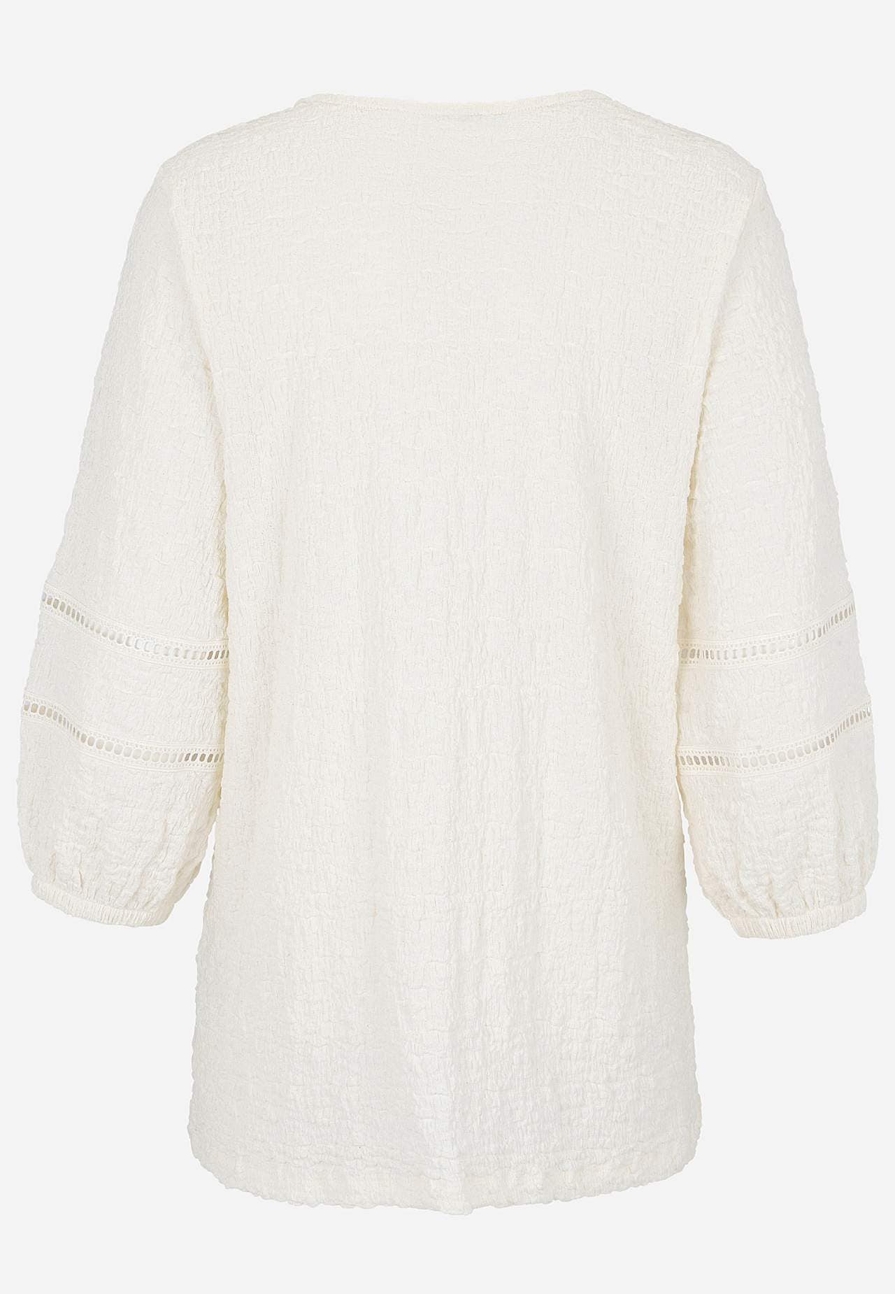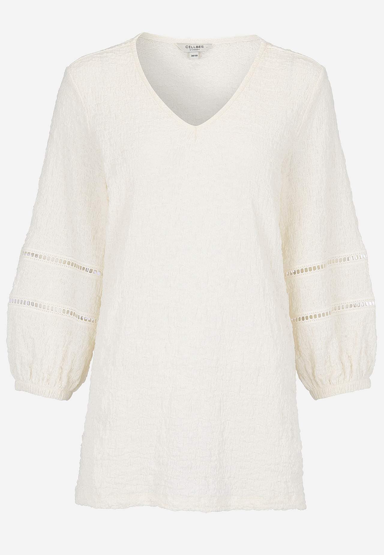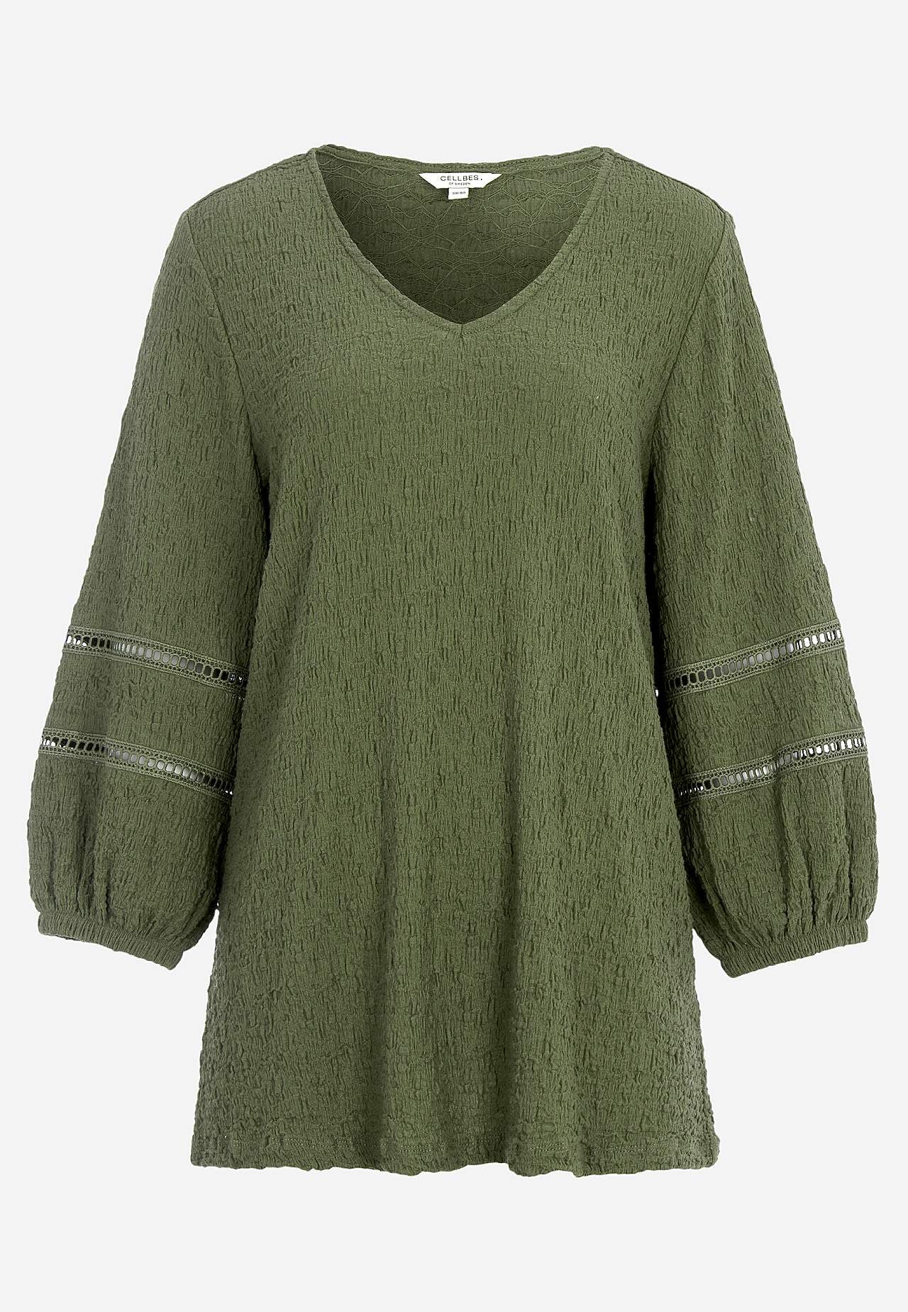 Tunic in comfortable, stretchy cotton-blend with structure. Nice details with openwork on the sleeves. Regular fit with gently flared bottom part. V-neck neck. 3/4 length, wide sleeves with elastic at the cuffs and decorative stitches with openwork. Straight hem. The back length varies with size: approx. 72-80 cm.
