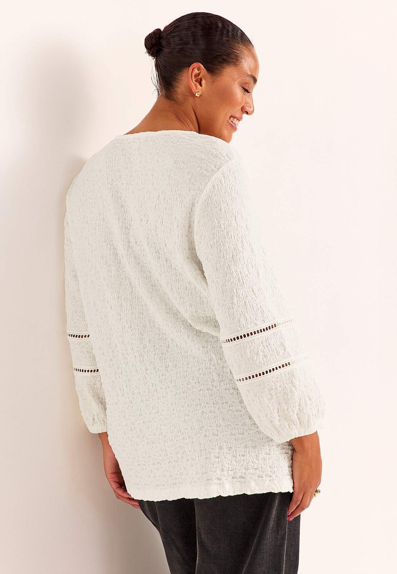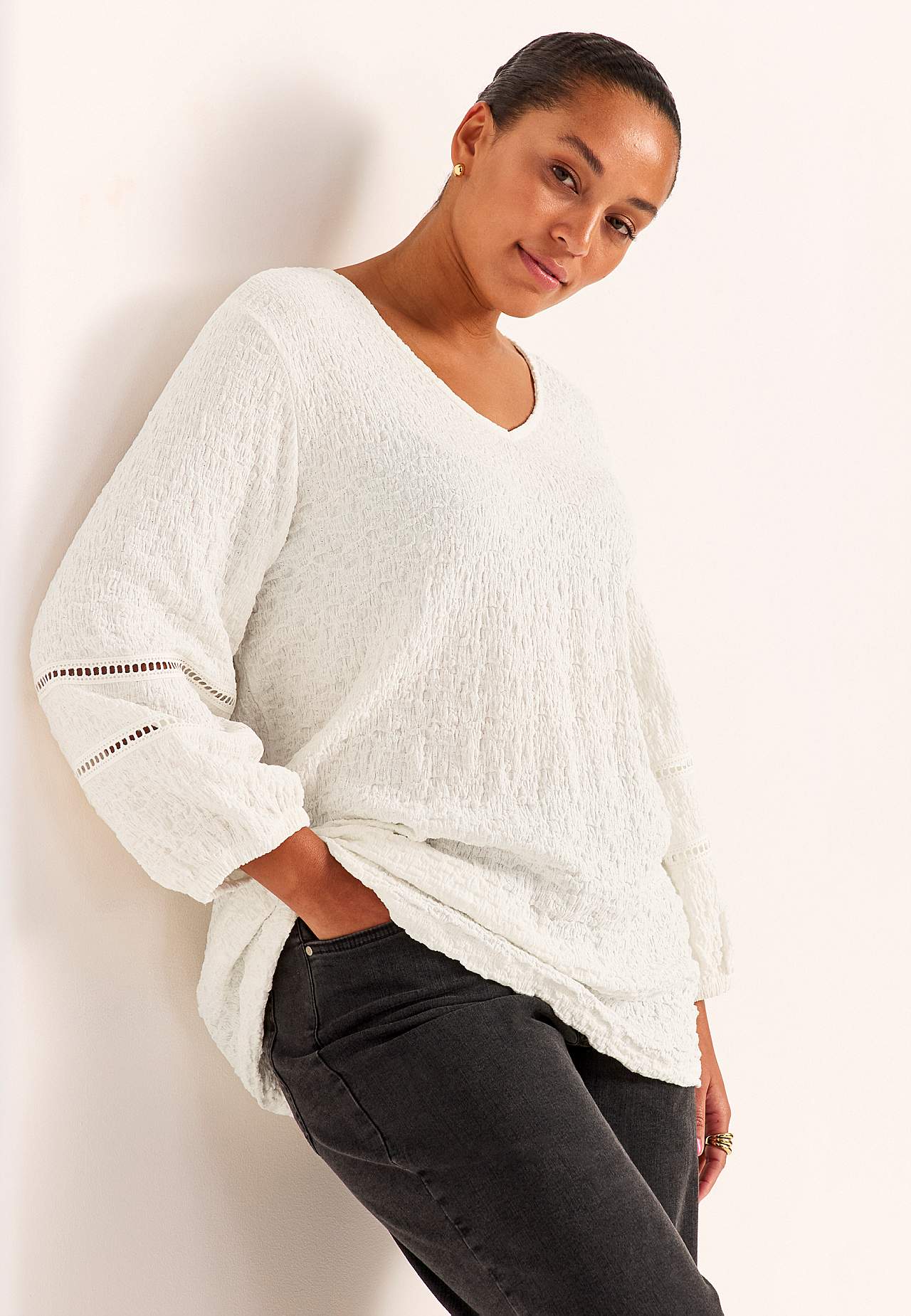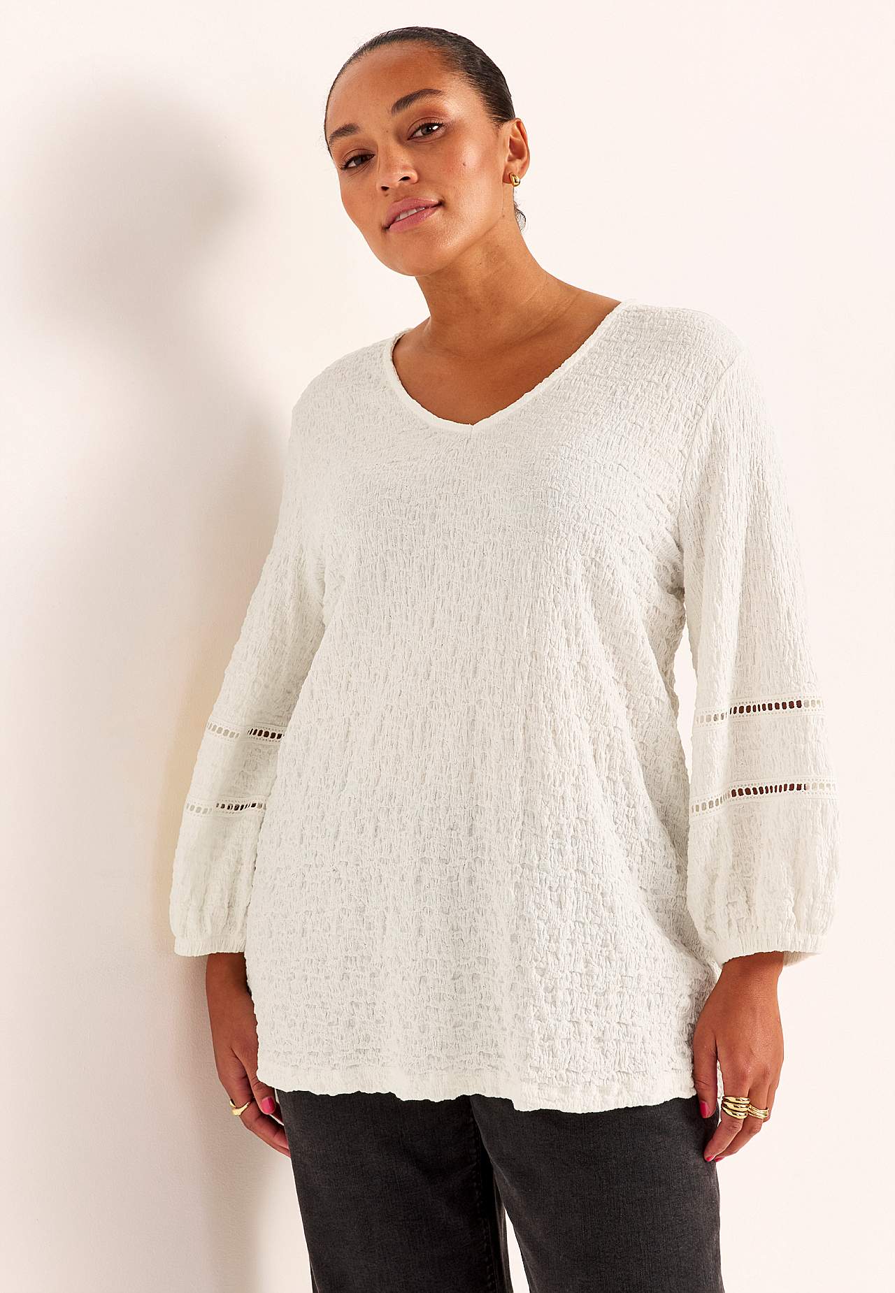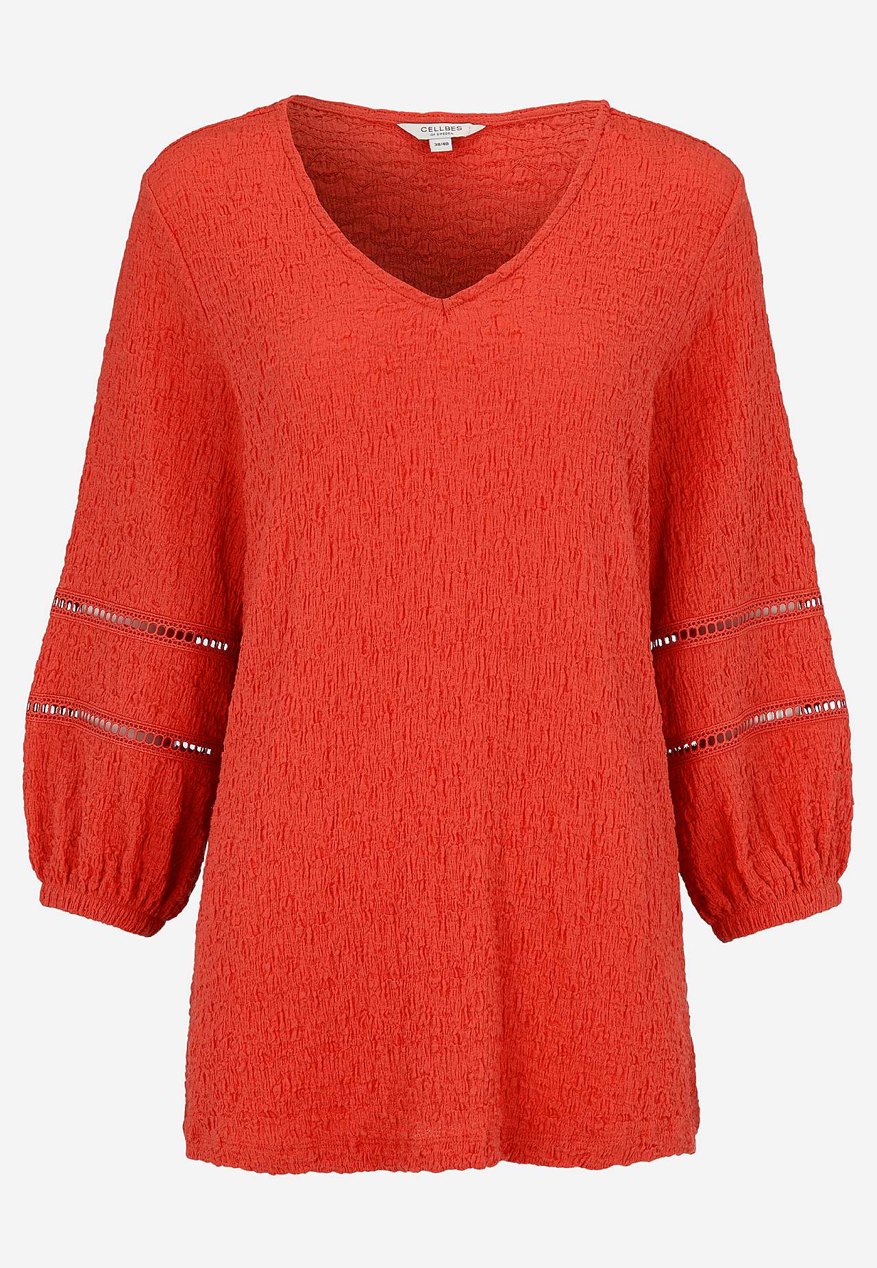 Tunic in comfortable, stretchy cotton-blend with structure. Nice details with openwork on the sleeves. Regular fit with gently flared bottom part. V-neck neck. 3/4 length, wide sleeves with elastic at the cuffs and decorative stitches with openwork. Straight hem. The back length varies with size: approx. 72-80 cm.